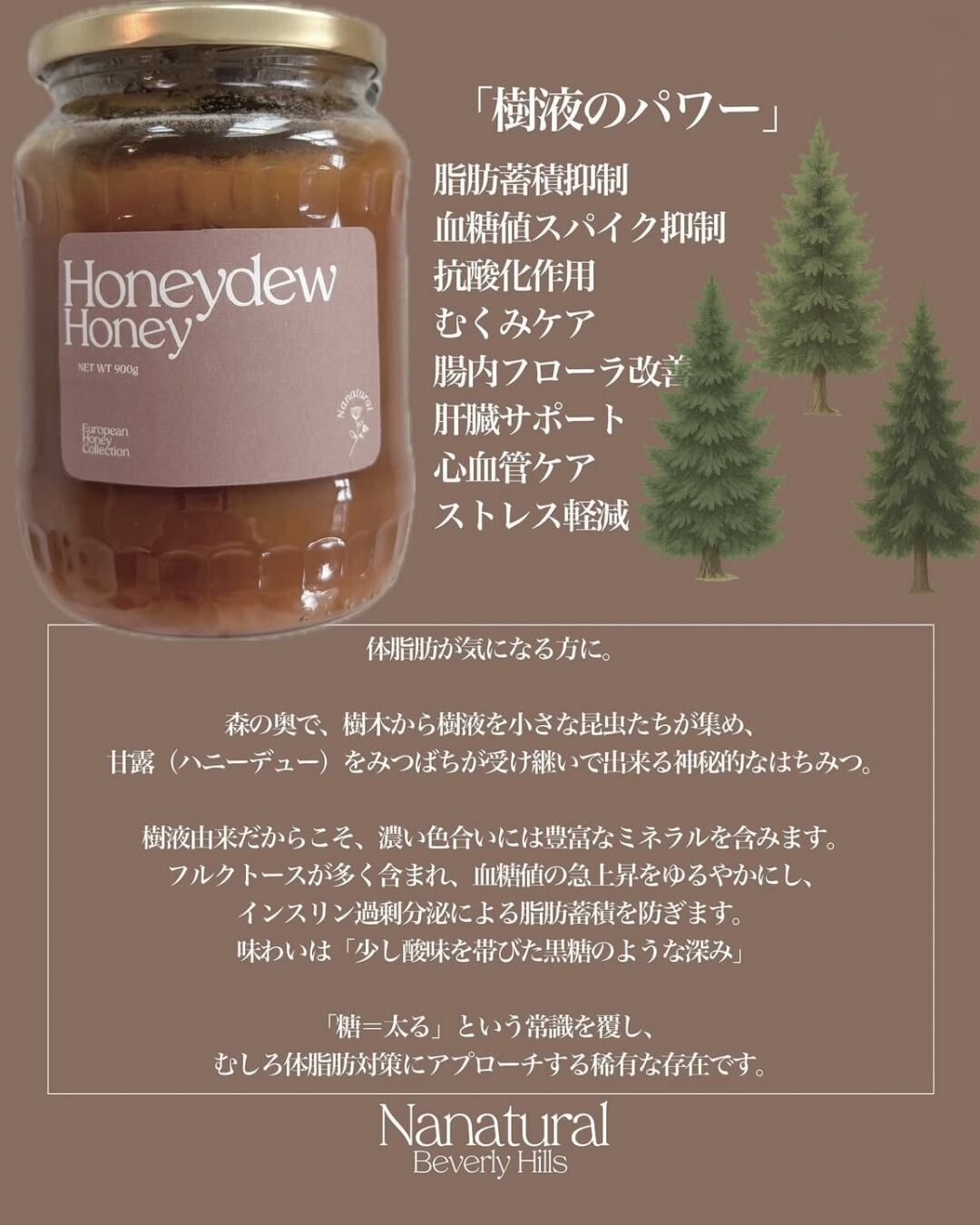 花のはちみつではなく樹液由来だからこそ、濃い色合いには豊富なミネラルと強力な抗酸化パワーが秘められています。さらにフルクトースが多く含まれ、血糖値の急上昇をゆるやかにし、インスリン過剰分泌による脂肪蓄積を防ぎます。